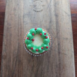 A Christmas spice cupcake dressed up a like a christmas wreath!
