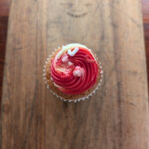 A white choc cupcake baked with crushed candy canes pieces. Topped with Candy Cane icing and sprinkles!