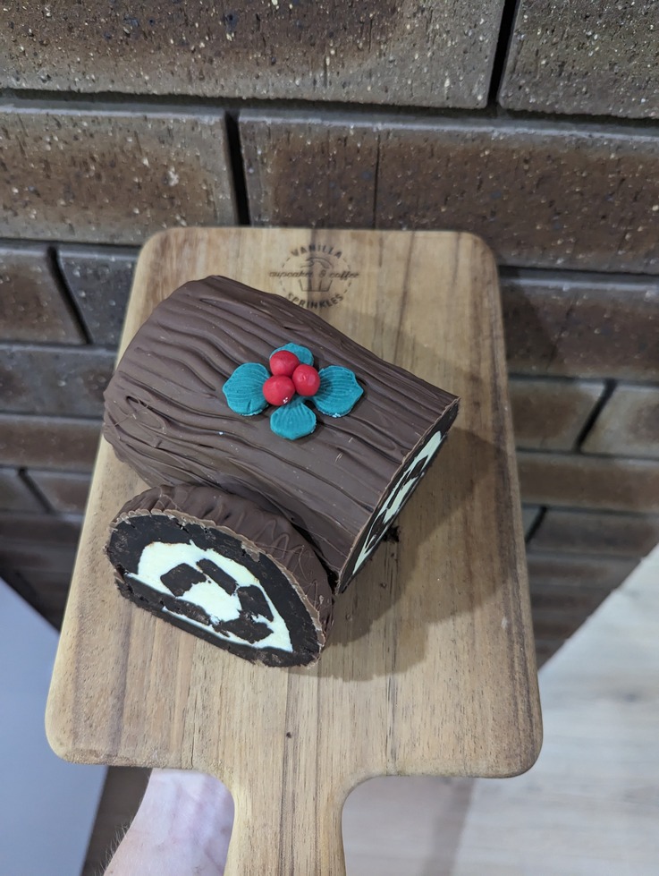 BACK AGAIN! Brownie Yule Log ! A decadent fudgey Brownie rolled up with Vanilla Buttercream coated in Milk Chocolate. Serves 8-10 decent sized pieces, best served with cream or icecream! Wrapped in its own decorative box finished off with ribbon!